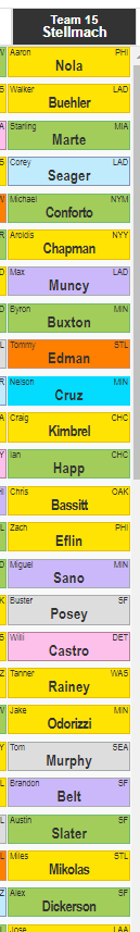 Starling Marte and Corey Seager at picks 45-46. Picking on the wheel I often shmoosh the two picks together in my mind. I really wanted a solid hitting foundation after starting SP-SP with my first two picks. These guys should provide a great batting average base, above average SBs (good/great from Marte, and basically zero from Seager), solid RBIs and HR, and outstanding Runs. I also considered DJ LeMahieu instead of Seager (draft was prior to DJL signing with NYY, so he was still available).