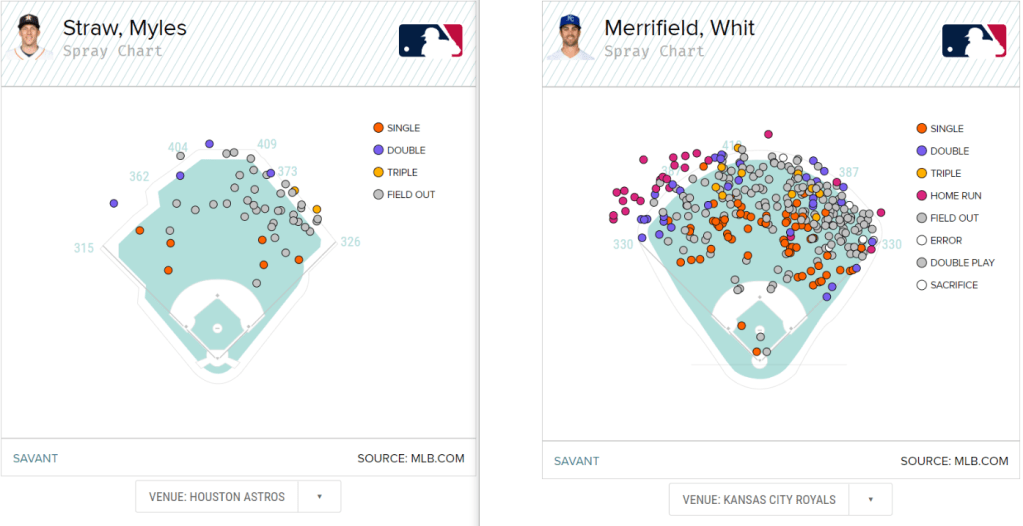 Merrifield is pretty low power, but he has a lot more power than Straw, and as I detailed here, to hit home runs Merrifield has to pull the ball. Even if Straw manages to hit a few balls in the air at 95+mph, does he pull it when he hits it in the air? No. Here is his 2019-2020 spray chart for batted balls greater than 15 degrees (with Merrifield’s for comparison):