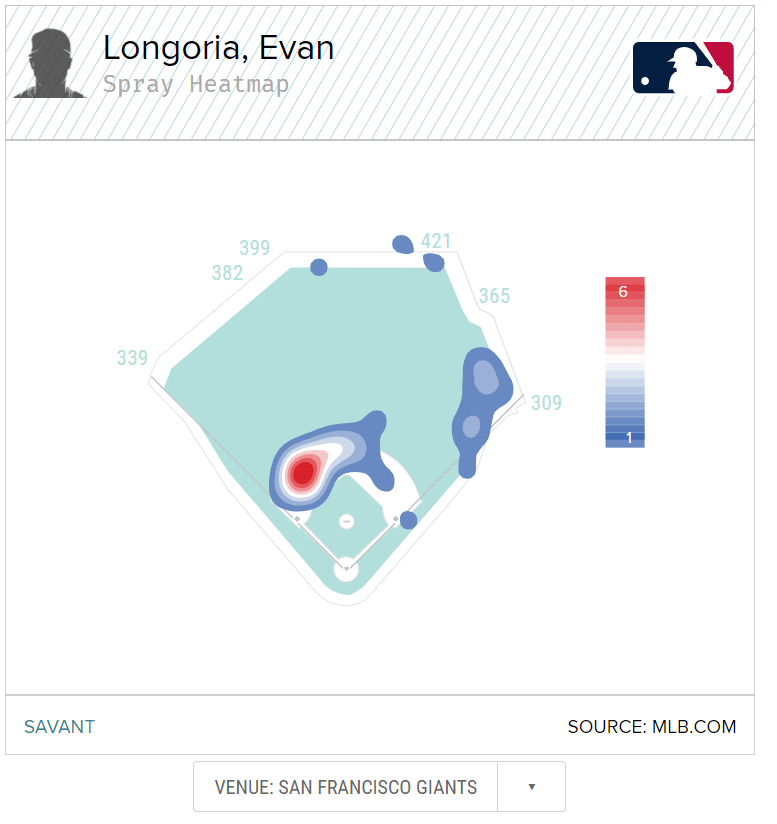 | Evan Longoria | 361 | 81 | 291 | 13 | 45 | 46 | 1 | 12.00% | 23.40% | 0.221 | 0.305 | 0.261 | 0.351 | 0.482 | 123 |