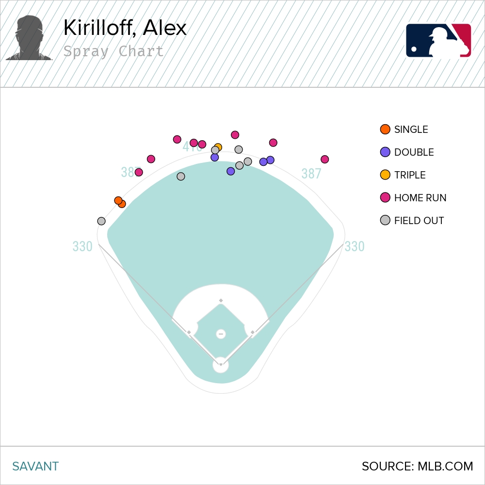 Statcast delineates straight-away CF as the zero-degree horizontal launch direction, with hits to the left of center having a negative horizontal launch direction and hits to the right of center having a positive horizontal launch direction. Kirilloff had one barrel in 2021 with a horizontal launch direction of greater than 10 degrees (a 431-foot shot pulled 19 degrees to the right of center).