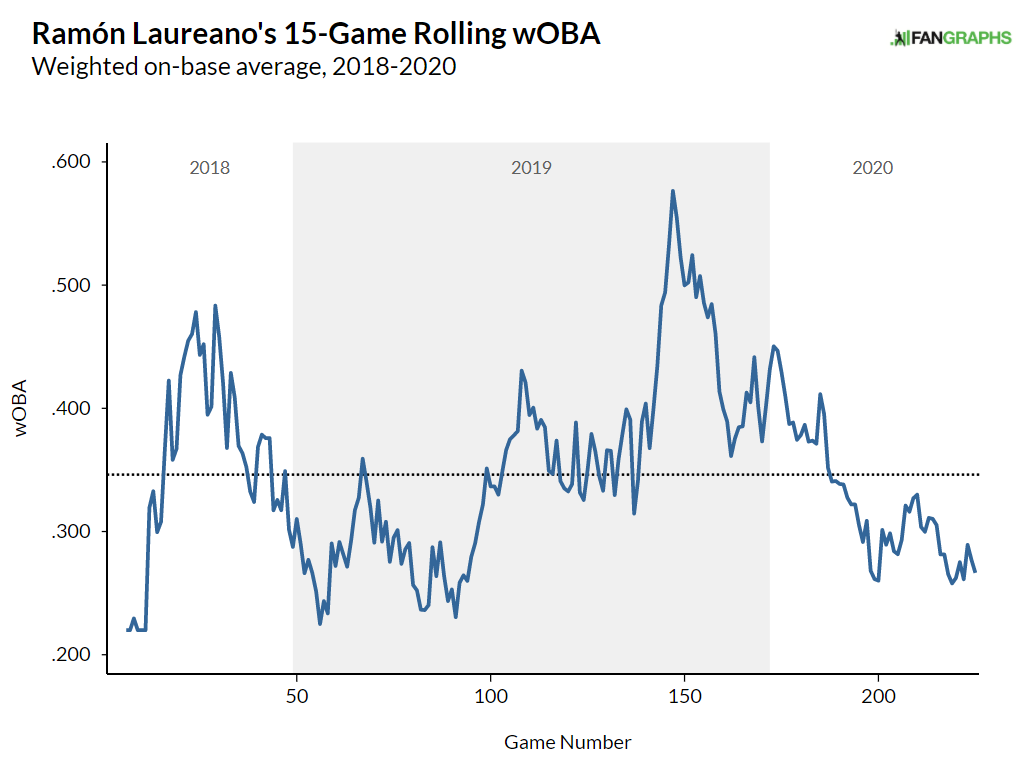 Straw’s GB/FB ratio went from 1.67 in 2019 to 0.84 in 2020. Flyballs are very nearly automatic outs for Straw – four doubles and three triples in 50 batted balls (and a few flair singles) in the > 15 degrees sample, and one of his 2019 triples was with Jorge Soler in right field and the other was with Domingo Santana, and both could have been caught (probably should have, at least in the Soler case). If you delve through StatCast, you can find that Straw generally does great up through 19 degrees launch angle. Whether by design, or just being “off,” Straw hit too many balls at higher than that launch angle in 2020.